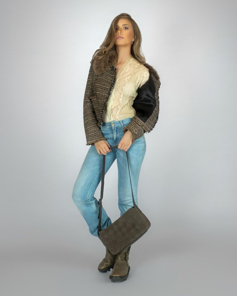 A brown Mango blazer combined with black Triumph pants, Diamant earrings, and Trippen shoes completes the editorial. This outfit balances strength and softness, offering winter outfit inspiration rooted in self-expression rather than excess.