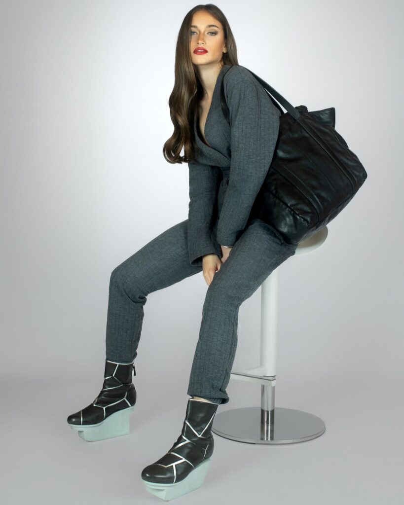 This look centers on a gray suit by Triumph, paired with a black Liebeskind bag, Diamant jewelry, and black Trippen shoes. Clean lines and neutral tones highlight longevity and versatility, key elements of winter fashion trends 2025.